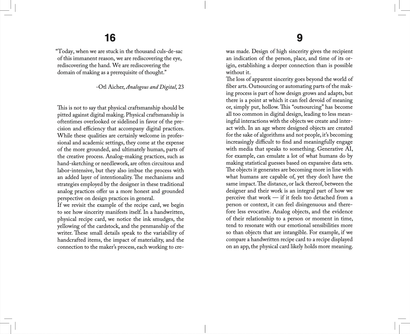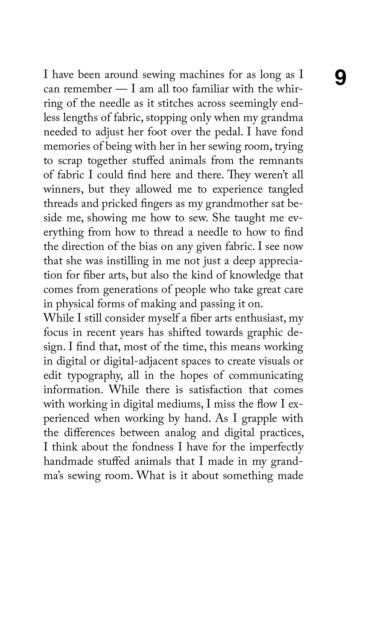 This book was one of my first major undertakings using Adobe InDesign. In order to decide on the size and ratio of the page, I looked to examples of books I liked and produced several blank “dummies” of varying dimensions and page count to get a sense of how the book would feel when being held. Since the topic of the book had to do with materiality and craftsmanship, I wanted to consider this at every point of the design process. I landed on a smaller, more vertical layout and that formed the basis for my grid.