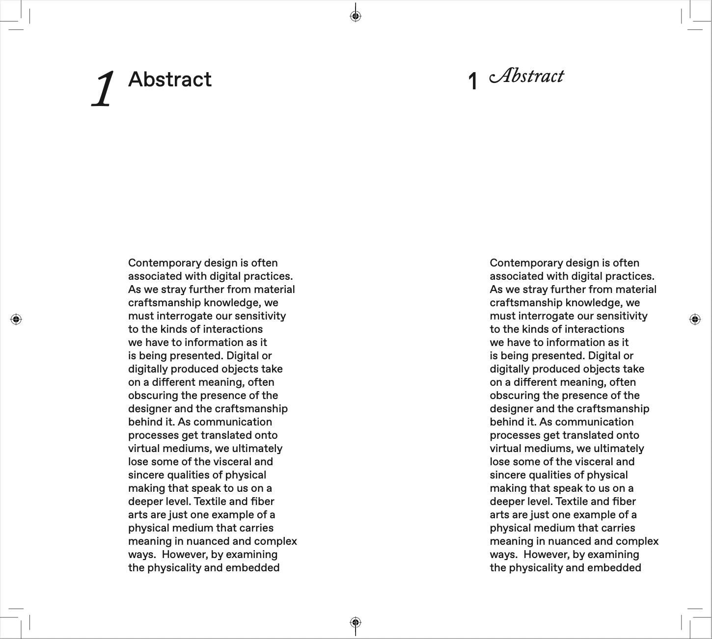When deciding on the typography, I wanted a more traditional style for the bulk of the text. Since the size of the book was not very large, I knew I wanted to print excerpts of my writing in various sizes to see which would work best. After comparing several serif fonts, I decided on Adobe Caslon. This became the basis for my design system, which would encompass headings, subheadings, body copy, page numeration, image captions, and more. I was able to have fun with the page numbers in terms of both typeface and scale, calling back to some of the experiments I display in the book.